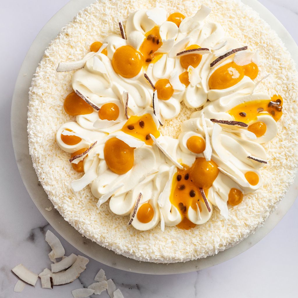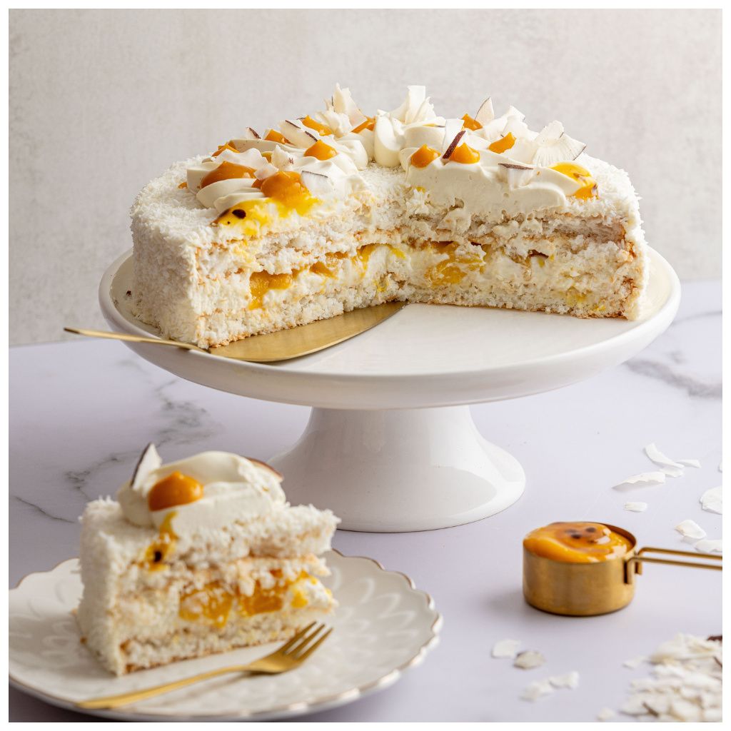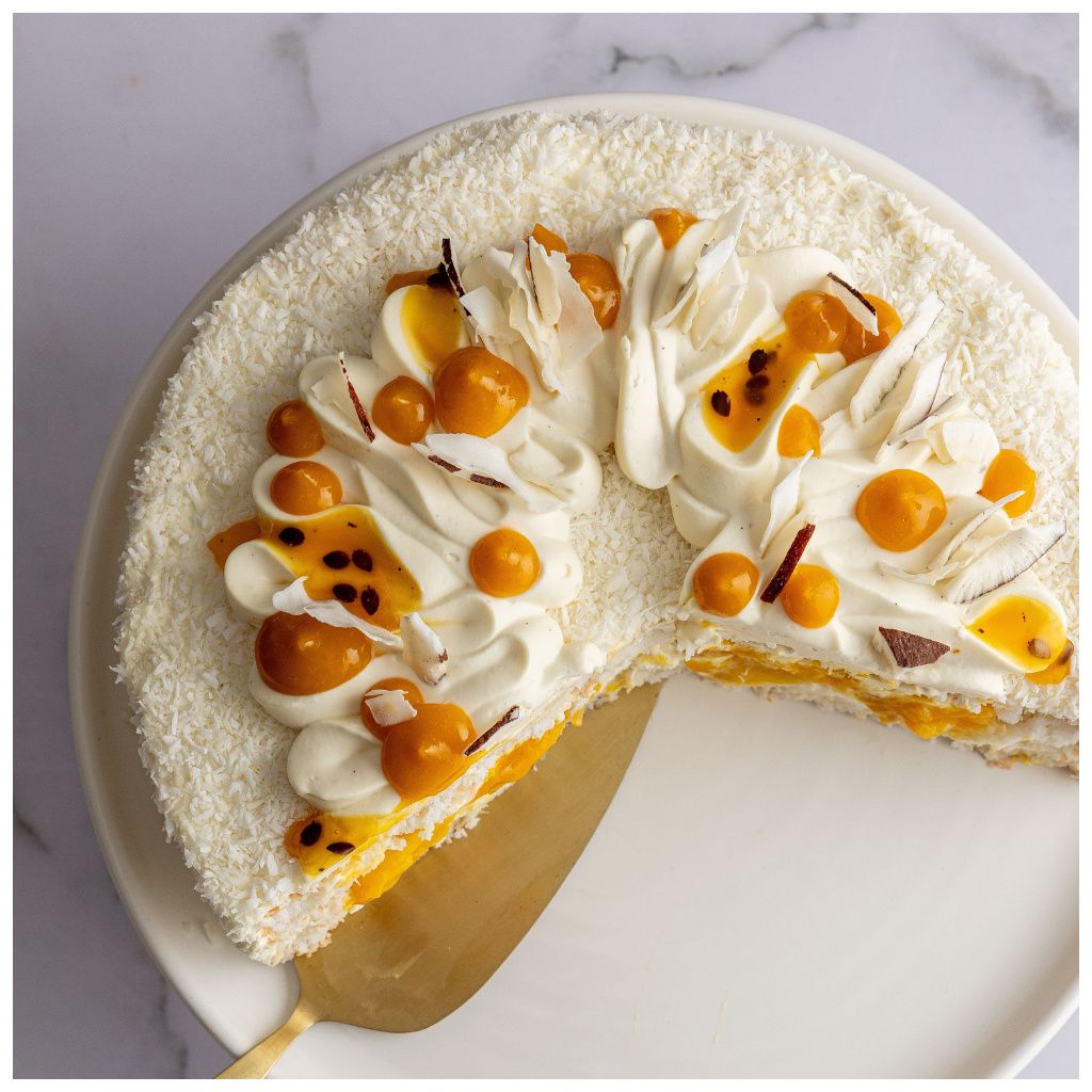 Přeneste se na sluncem zalitou pláž díky exotické kombinaci manga, kokosu a passion fruit. Lehký bezlepkový korpus dacquoise tvořený bílkovým sněhem a kokosem je proložen lahodným krémem z našlehané vanilkové ganáže, mascarponea šlehačky, ve kterém vás okouzlí mangové chutney s opravdu velkými kousky šťavnatého manga. Díky spojení pyré z manga a passion fruit s vanilkovou ganáží bude tenhle dort vaší novou závislostí.